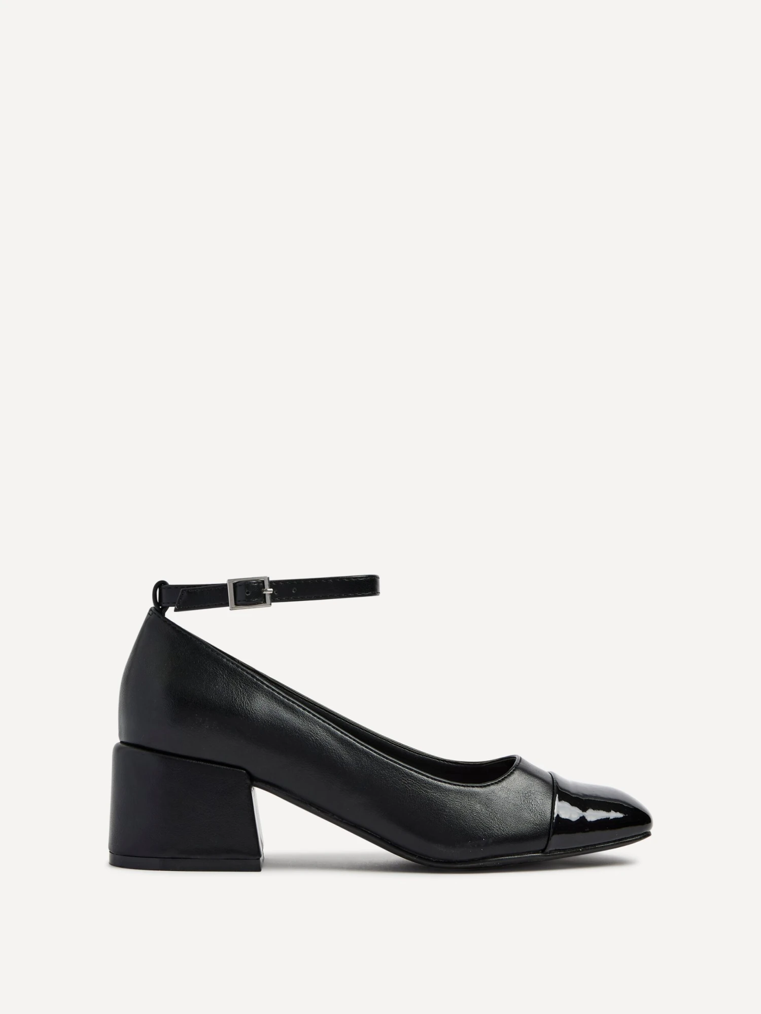 Elevate your style effortlessly with our Emelia block heeled shoe. A timeless yet modern footwear staple. Featuring patent front detail and a wrap around ankle strap. Heel height: 5.5cm