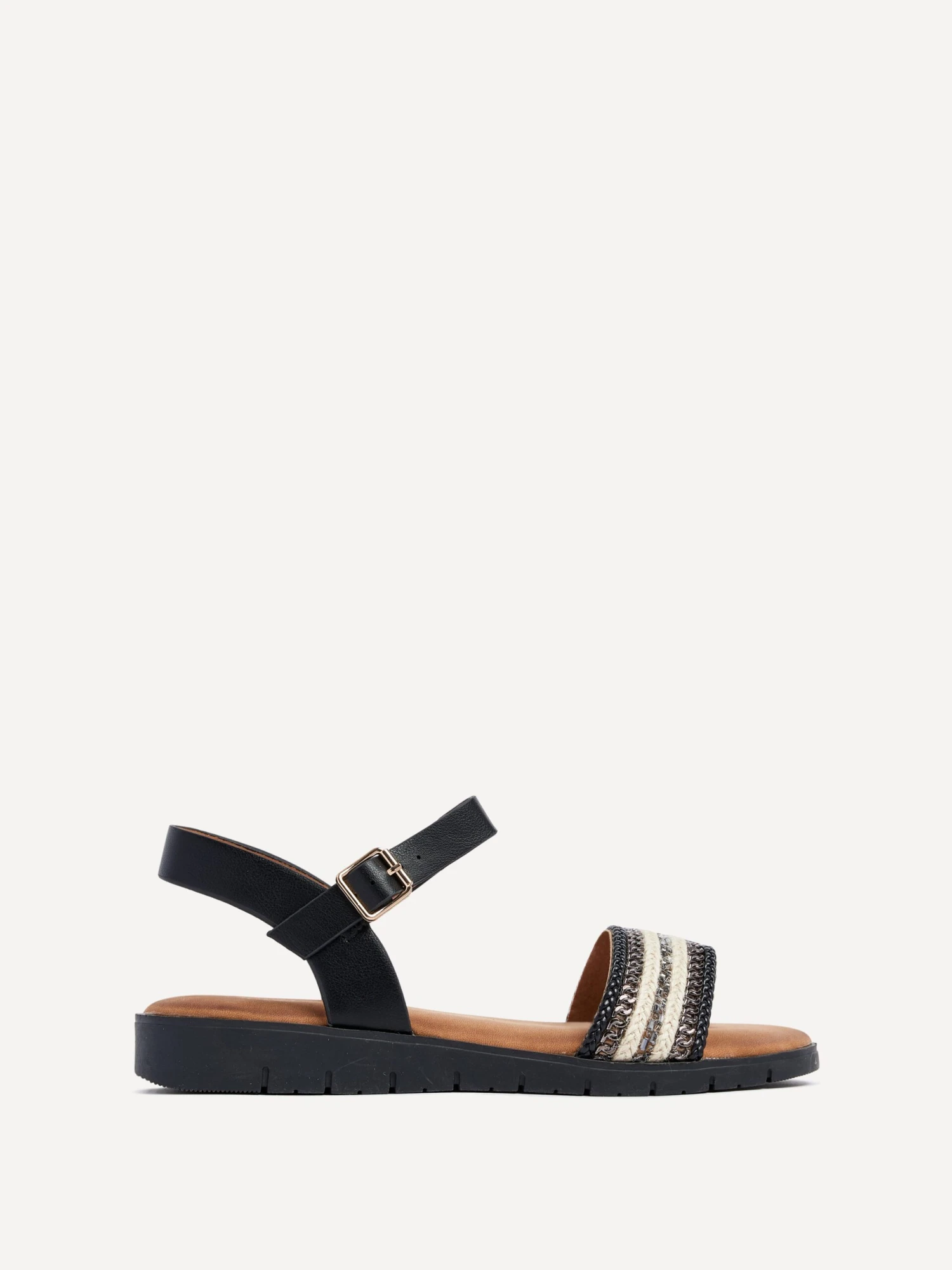 Enhance your summer look with the Faye flat sandal. Featuring a beautifully embellished front strap and an extra padded footbed for ultimate comfort. Step out in style and embrace the season with Faye!