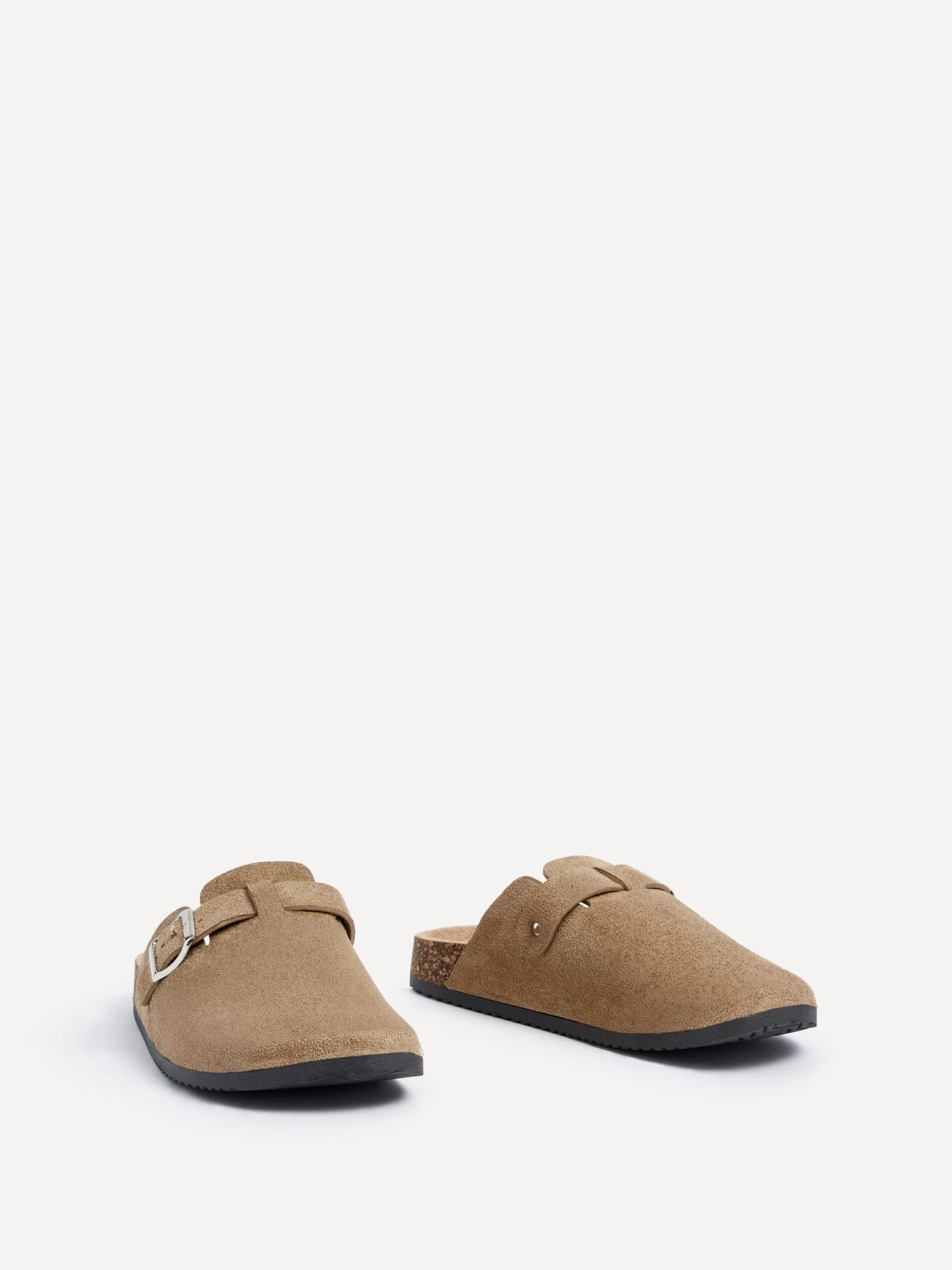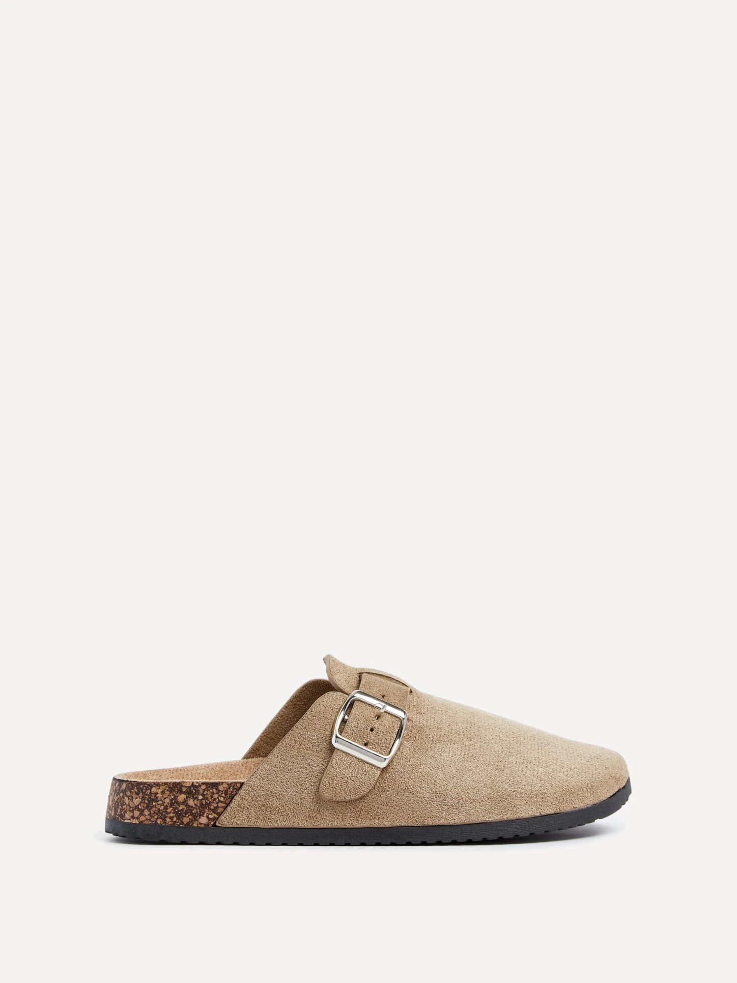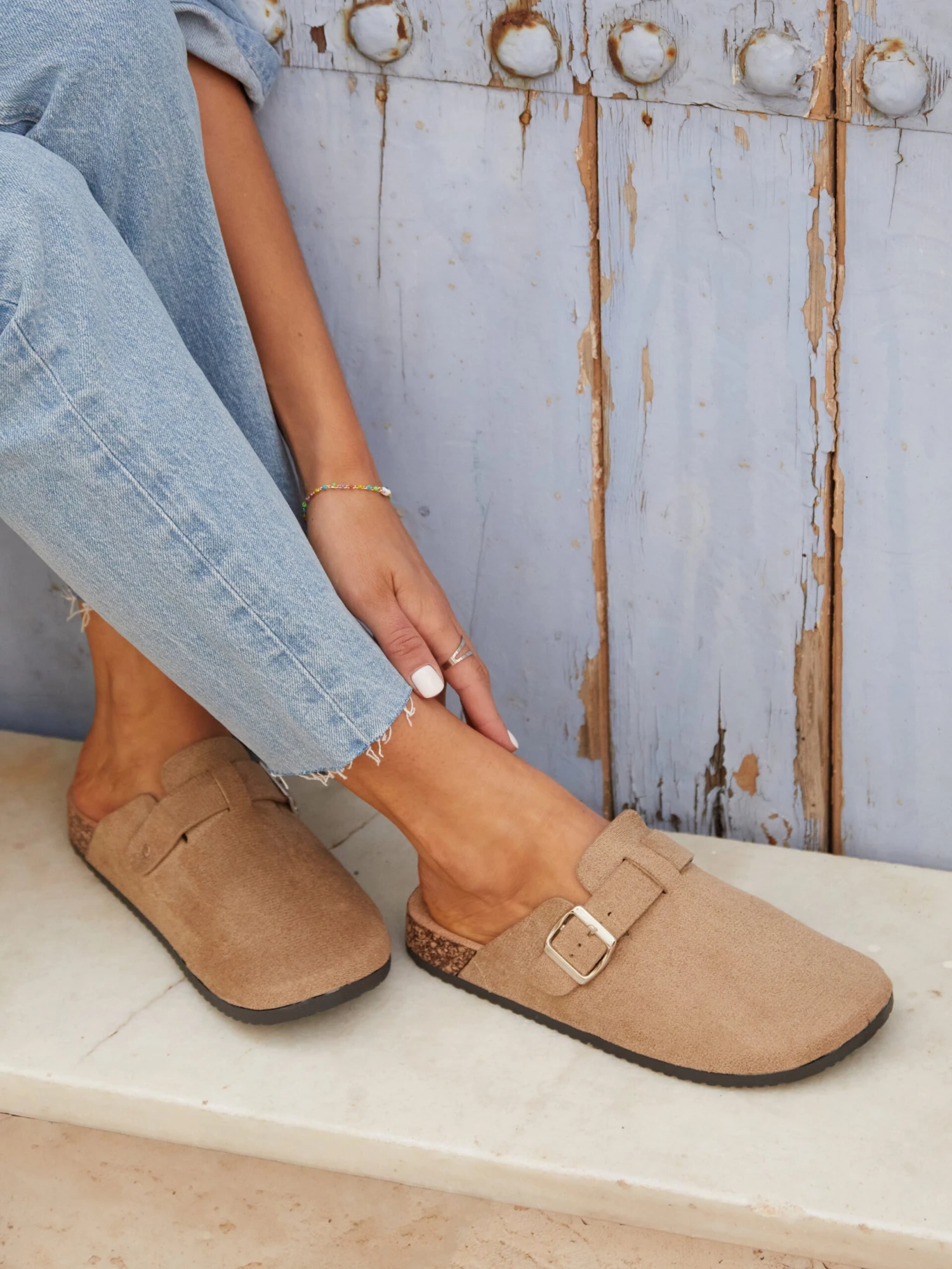 A soft faux suede clog style slider sandal featuring a front buckle detail. A stylish and comfortable addition to your spring/summer wardrobe, perfect for pairing with a cute summer dress or jeans. The insock is made of faux suede for added comfort.
