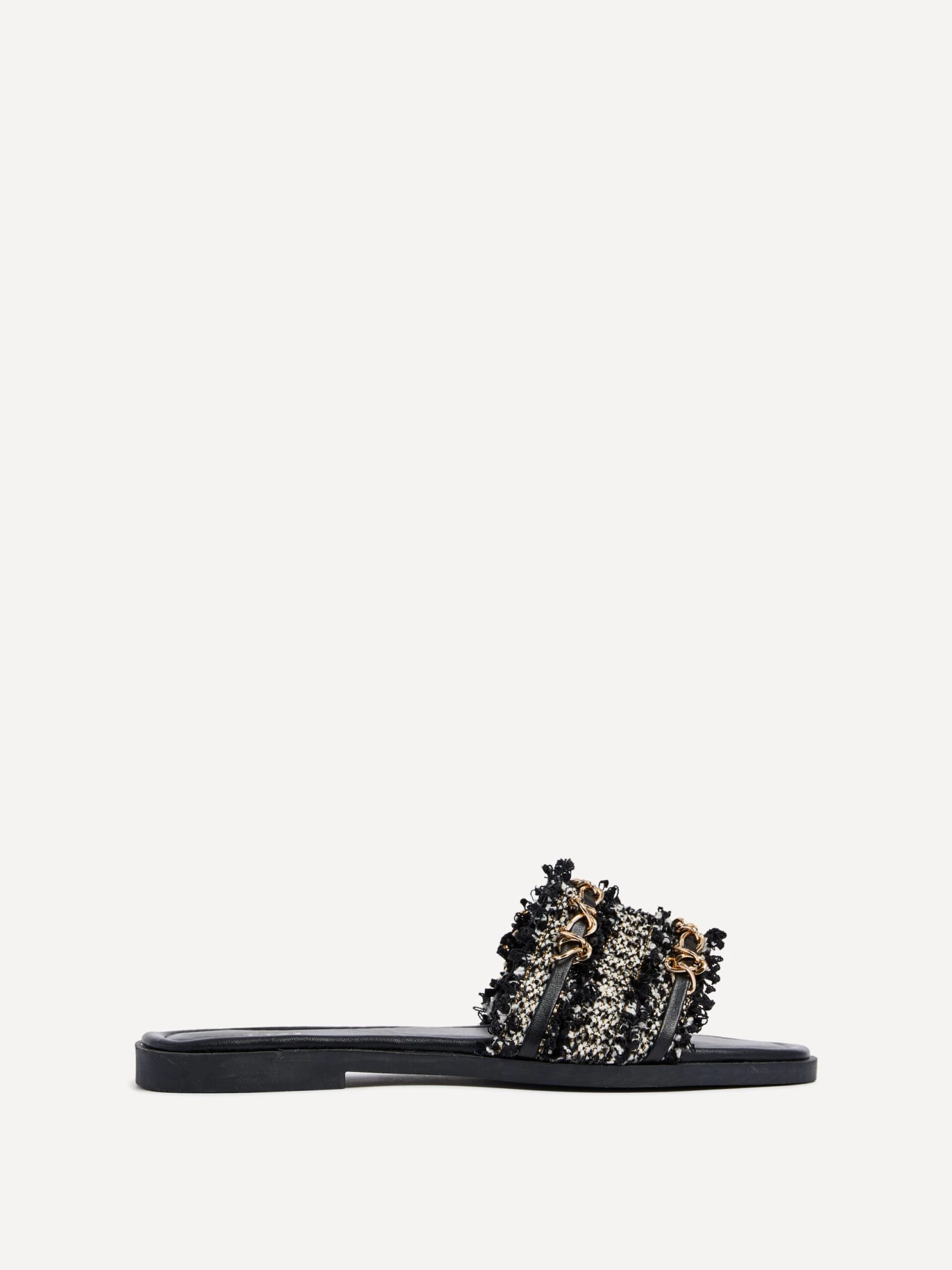 Indulge in the luxurious feel of our Faux Leather Frayed Chain Front Slip Ons, featuring a padded insole for ultimate comfort and a chic, statement-making chain detail.